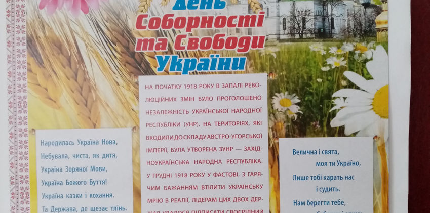 Для школярів 5-7 класів були проведені тематичні уроки національно-патріотичного спрямування. Була проведена година пам'яті « Соборна мати, Україно, одна на всіх , як оберіг!» Ми українці і ми повинні любити, шанувати, оберігати нашу рідну землю, пам’ятати історію України та з почестю вшановувати історичні пам’ятні дати. З учнями було проведено вікторину «Як я знаю Україну?». Під час свята діти згадали важливий момент історичного минулого - День злуки ЗУНР та УНР в одну державу та нинішню боротьбу проти російської агресії, як віхи єдиного процесу боротьби за незалежність України. Захід завершився виконанням гімну України.
